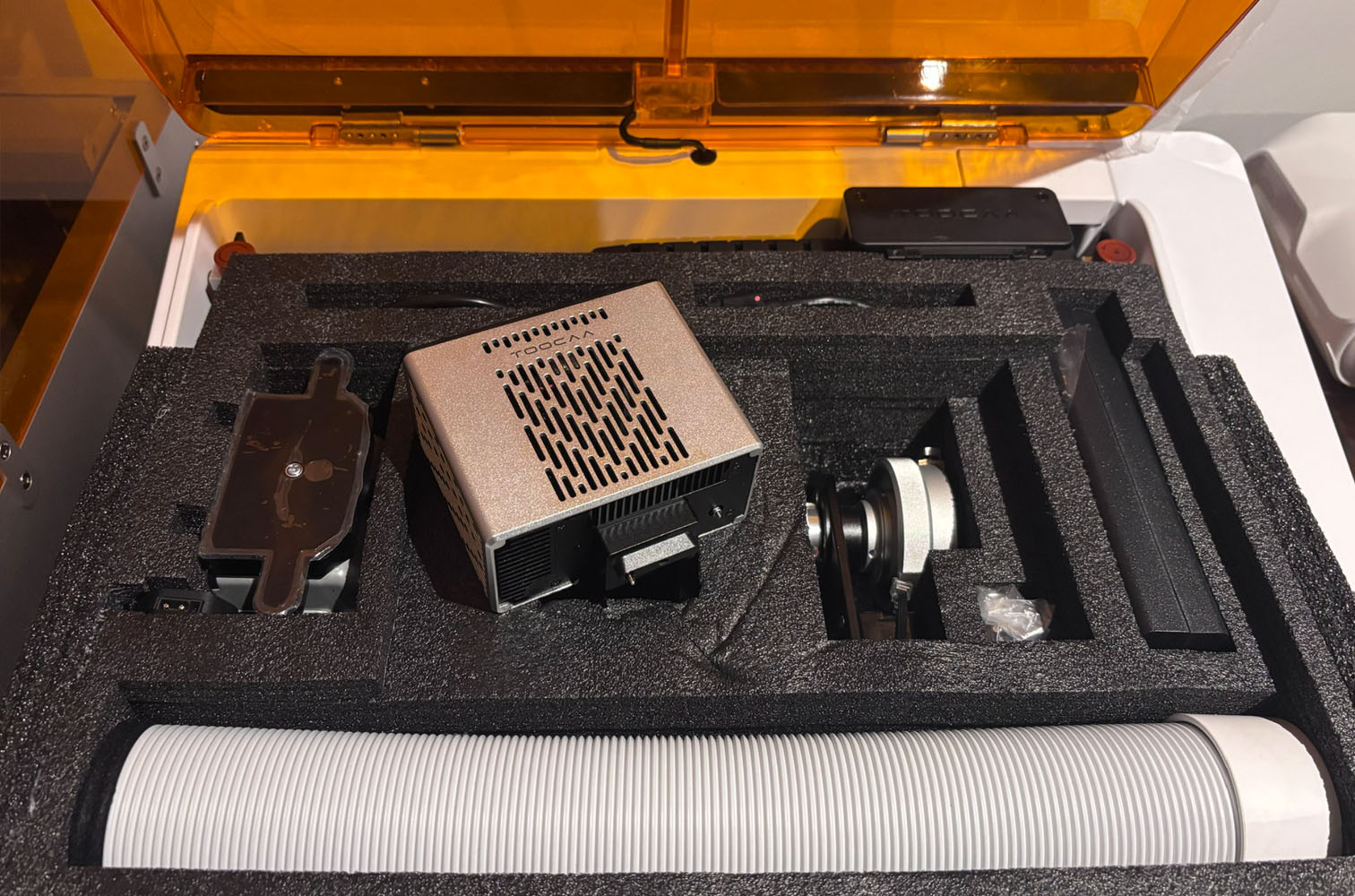 The most complex step was simply locating the two screws to attach the laser module. In a brilliant touch of design, they were neatly hidden inside a dedicated ‘tool compartment’ on the machine, along with an Allen key, a spare lens, and a lens cloth.